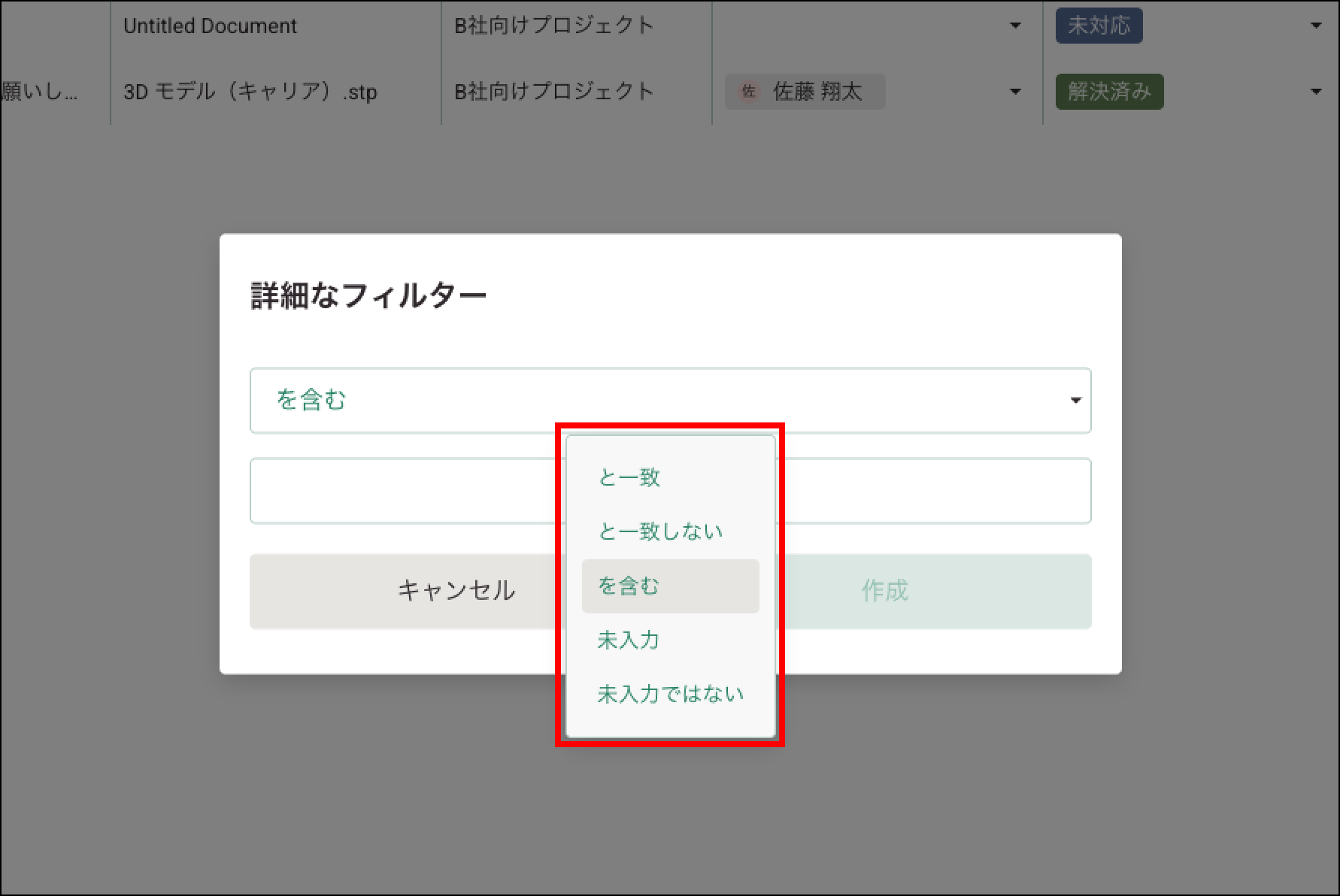 ルール(例:を含む、と一致、未入力)を選択し、値を入力して [作成] をクリックします。