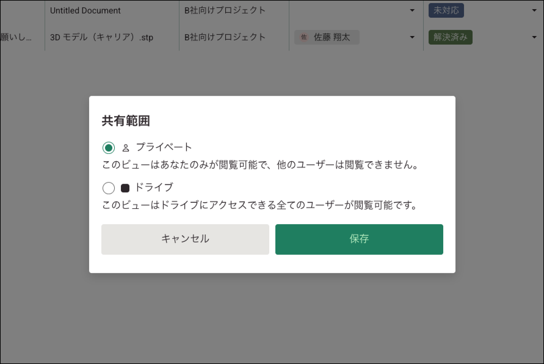 ビューの公開範囲を設定する Yuwa Koresawa 2025年08月19日 03:33 更新 ビュー メニューを開きます。[公開範囲を編集] を選択します。[プライベート](自分のみ)または [ドライブ](ドライブにアクセスできる全員)を選択し、[保存] をクリックします。プライベートビューには名前の横にアイコンが表示されます。 関連記事 Issuesの使い方の流れ コメント 0件のコメント サインインしてコメントを残してください。