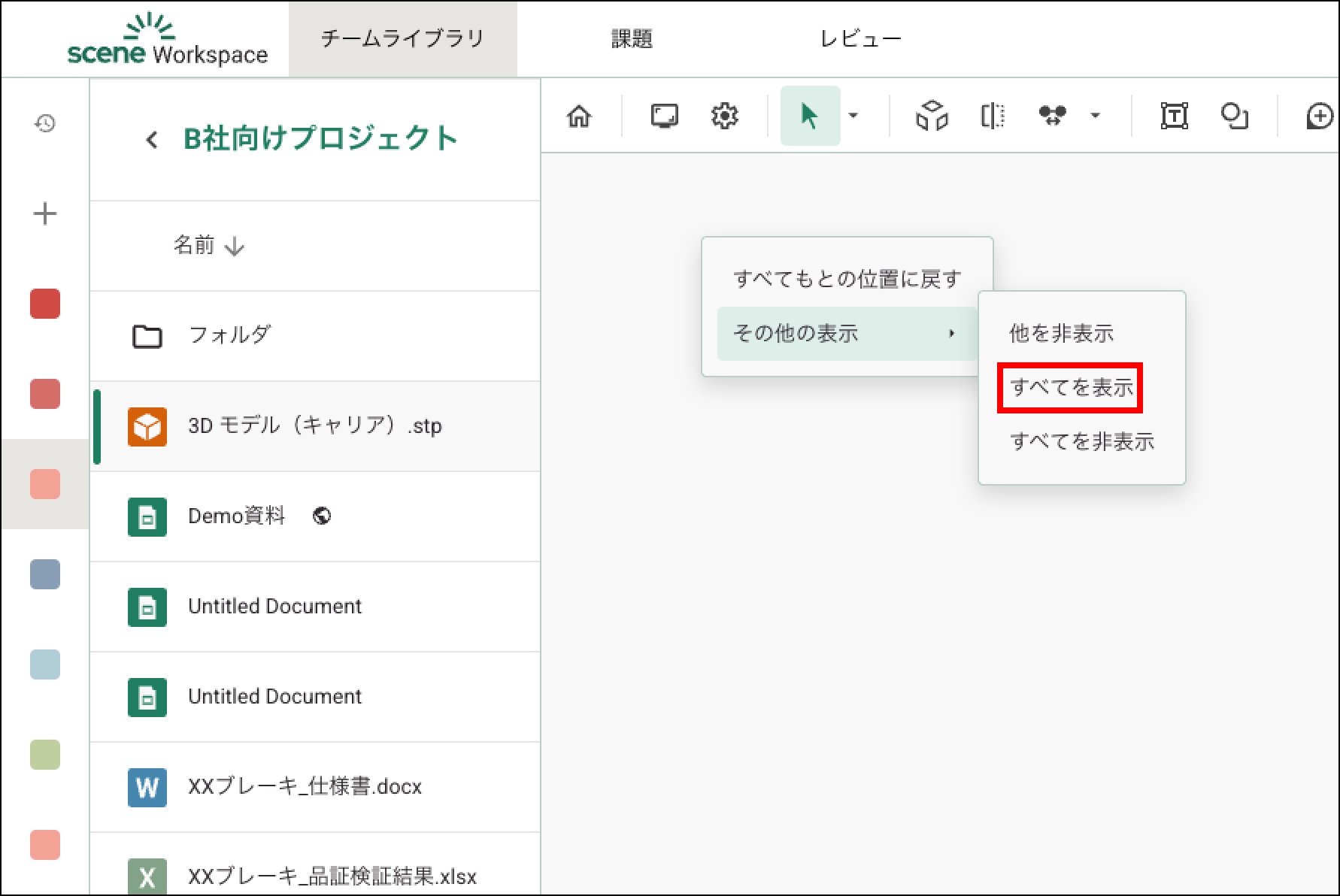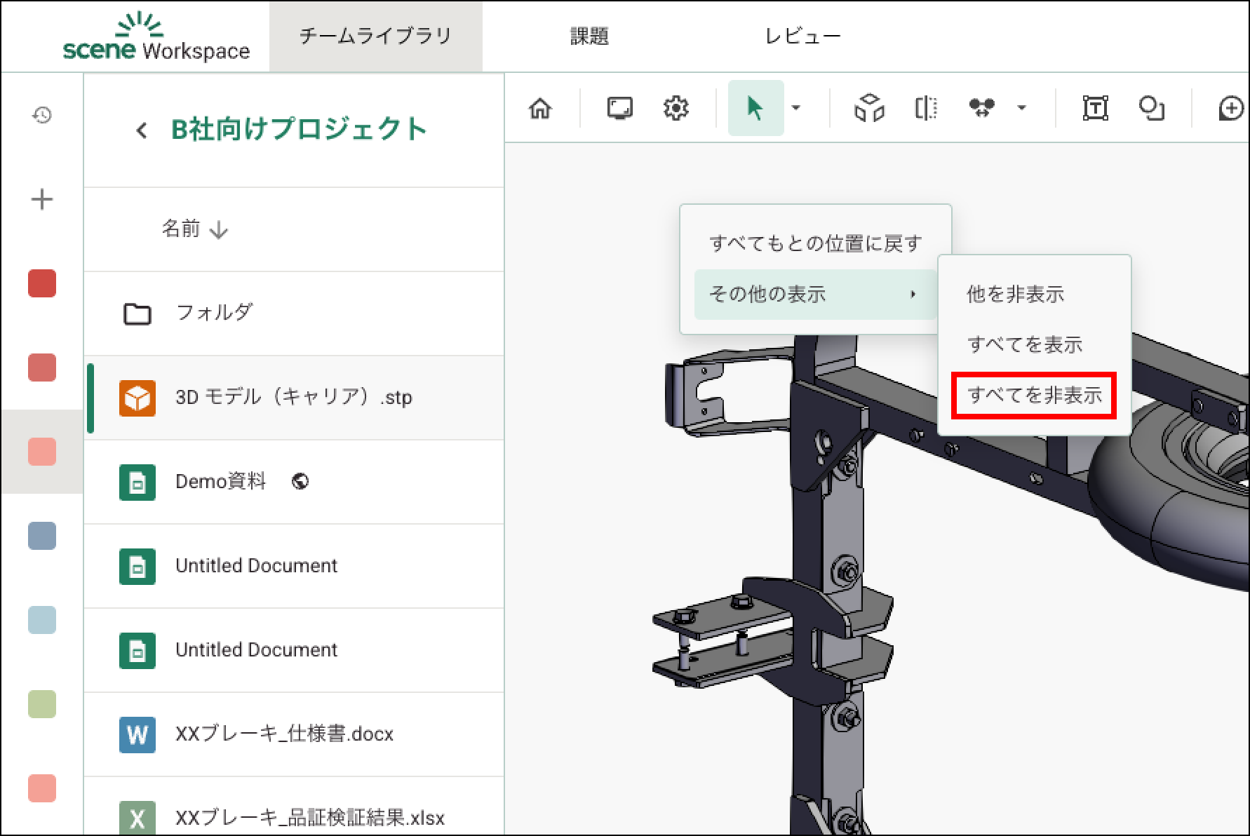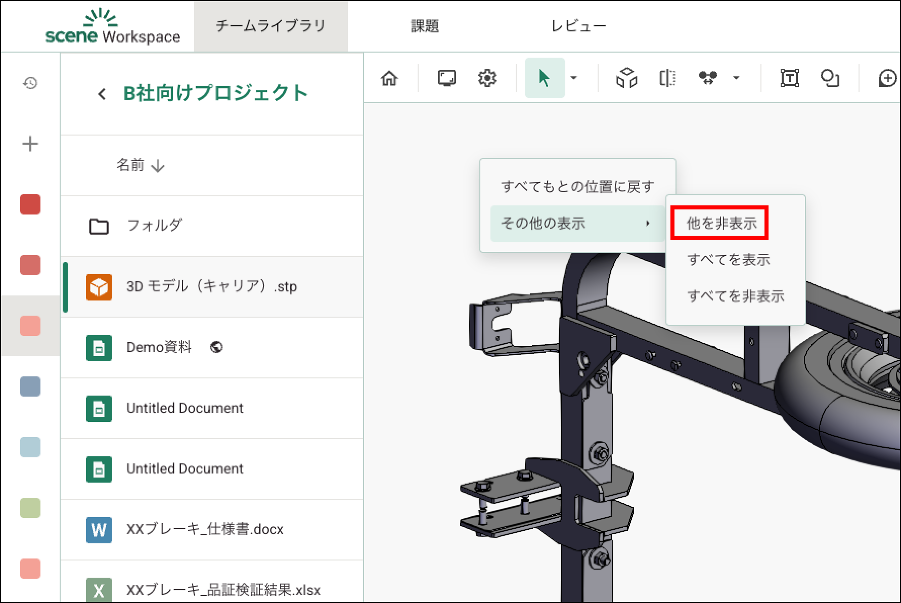 その他の表示 Yuwa Koresawa 2025年08月19日 03:37 更新 ビューアーで右クリックすると、コンテキストメニューが表示されます。「その他の表示」を選択すると、次の操作が行えます。他を非表示選択したパーツ以外をすべて非表示にします。すべてを表示非表示にしたパーツをすべて表示します。すべてを非表示3Dモデル全体を非表示にします。 関連記事 ユーザー管理 コメント 0件のコメント サインインしてコメントを残してください。