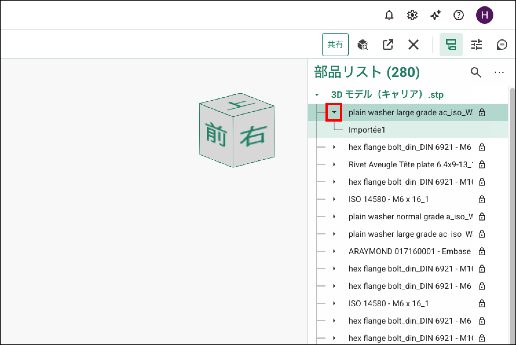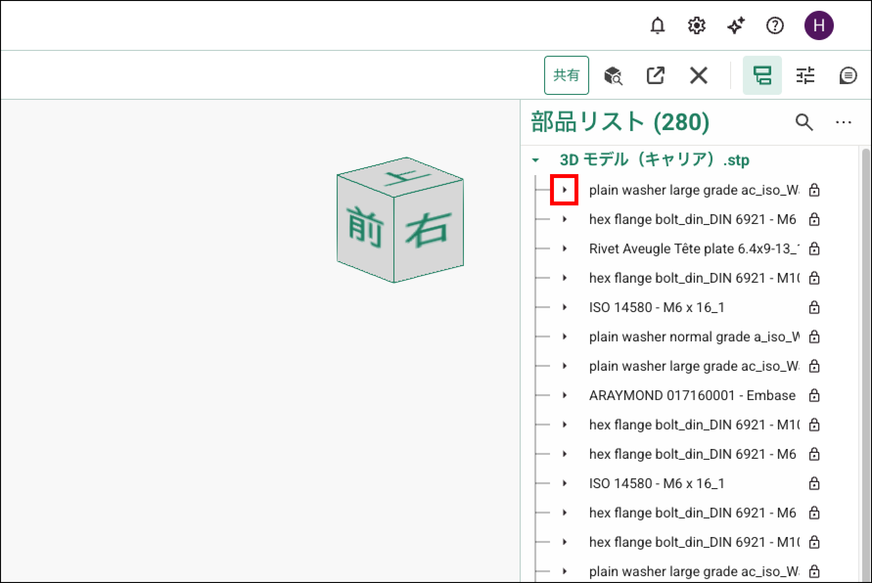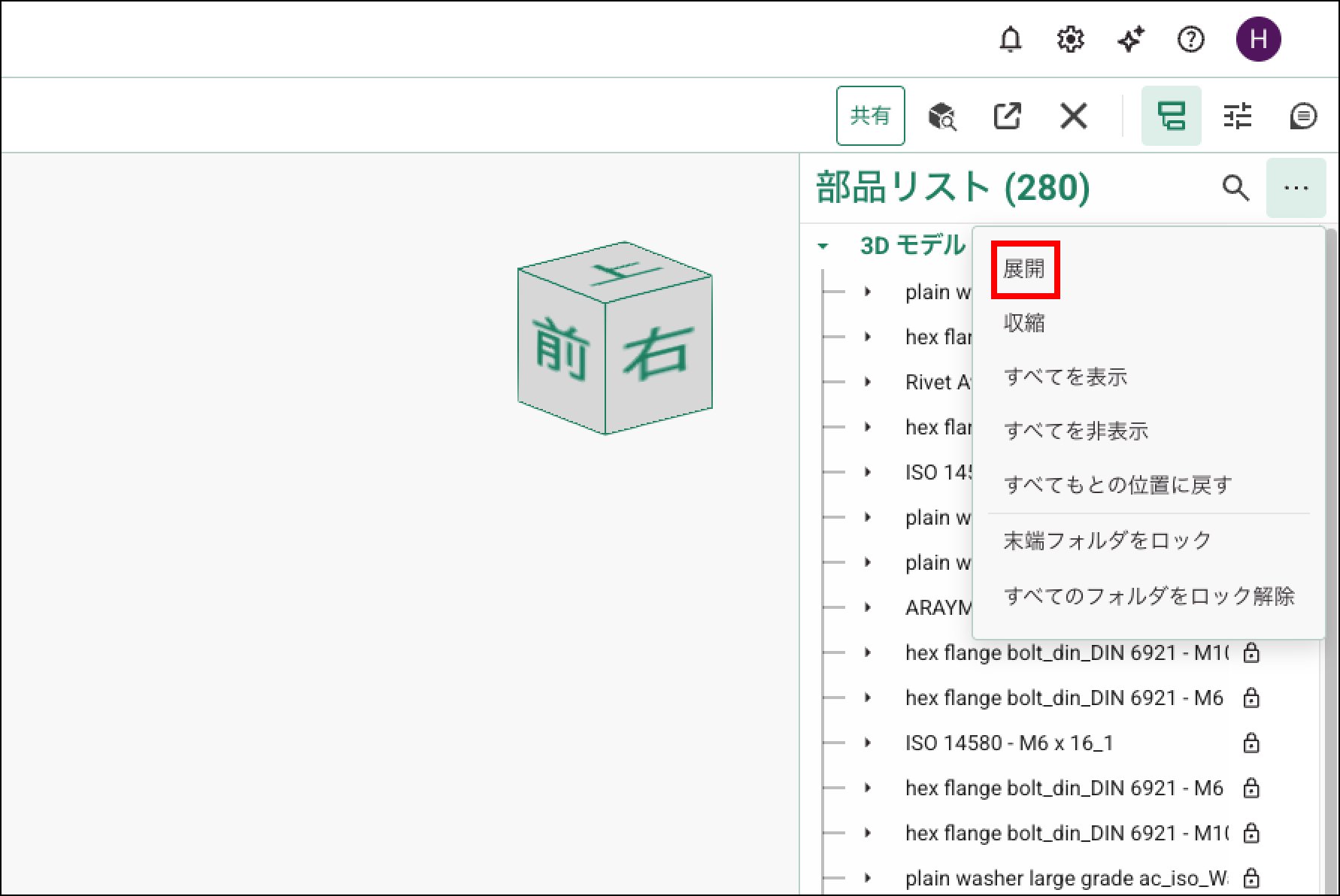 「展開」をクリックすると、すべてのパーツを展開できます。