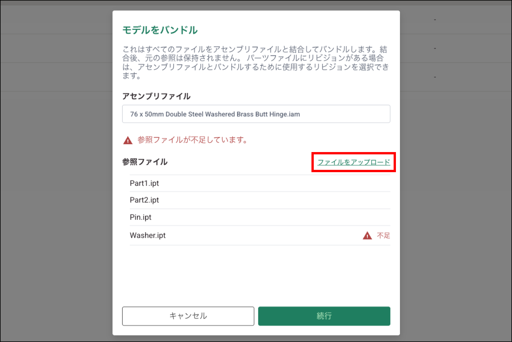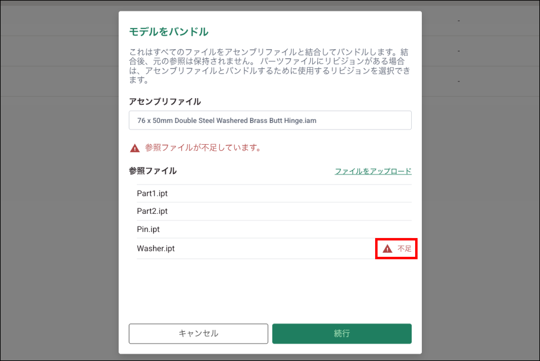 バンドル時に参照ファイルが不足している場合、どのファイルが不足しているかを示すメッセージが表示されます。