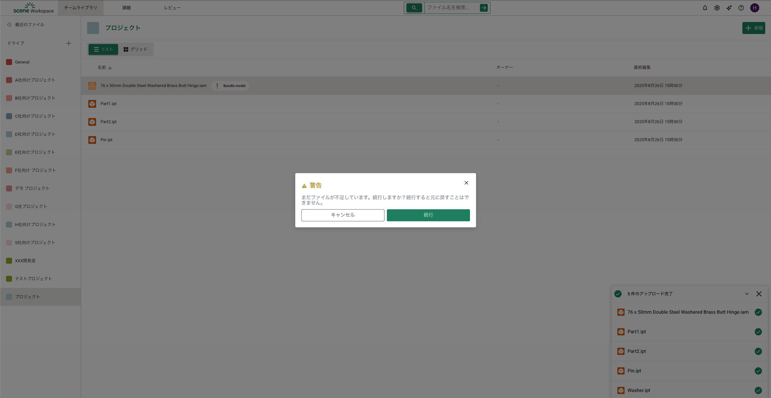 不足ファイルは「ファイルをアップロード」をクリックして選択・アップロードできます。修正せずに進む場合は「作成」をクリックします。